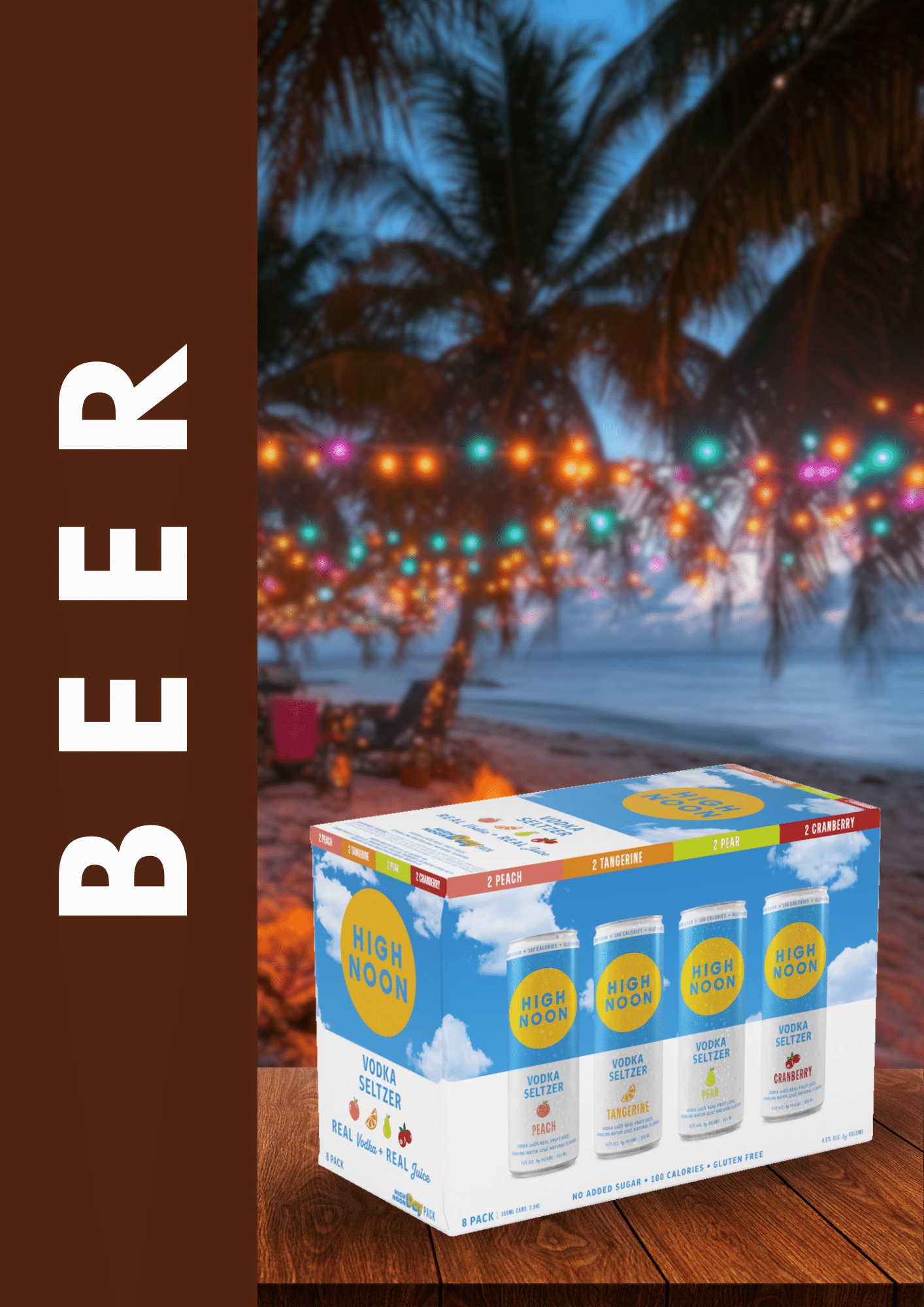 The High Noon Beach Variety Pack features refreshing vodka seltzers in Kiwi, Raspberry, Peach, and Lemon flavors, all made with real vodka and real fruit juice. Each can is gluten free, has no added sugar, and delivers a crisp, clean taste perfect for any occasion